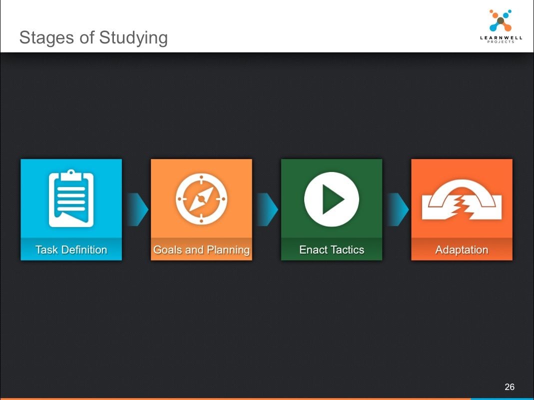 Often we perform tasks without clearly understanding how the task unfolds. The Stages of Study sequence shows students the stages in which they routinely engage when studying. This illustration is used to help students break down, and thus slow down the interrelated steps involved in studying. Tutors are able to then address the tasks in isolation.