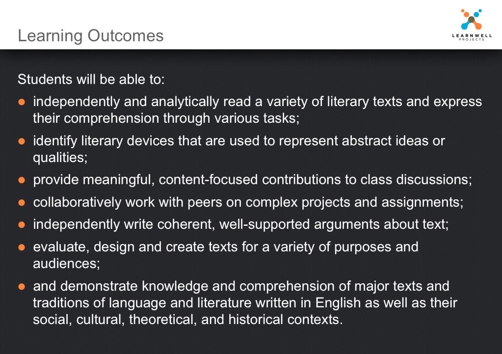 These learning outcomes provide a robust framework for students to figure out what content they are responsible for learning, which types of thinking they will need to sufficiently express the content, and the task(s) on which they’ll be required to demonstrate their knowledge.